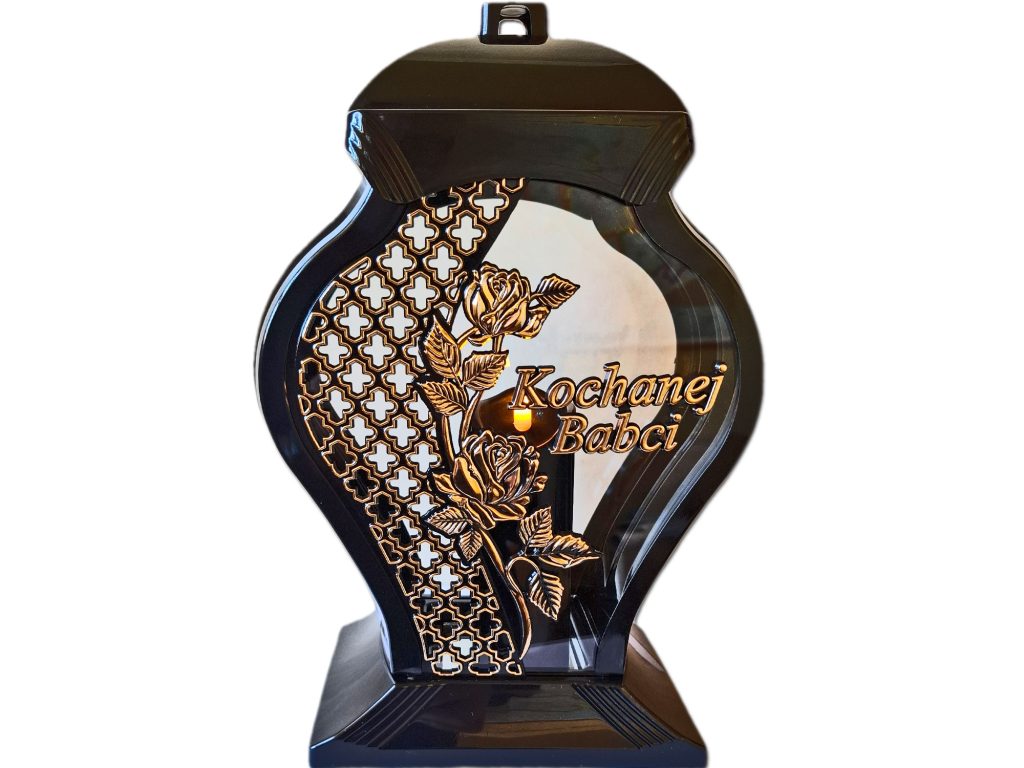 - kolor znicza: szyba przednia przezroczysta ze złotą ażurową wstawką i kwiatem w kolorze złotym ,tylna przezroczysta,boczki przyciemniane,pokrywa i podstawa(czarna)