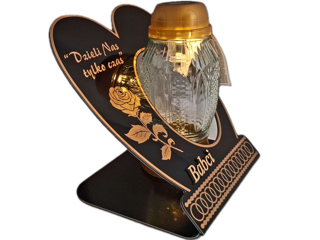- kolor znicza: szkło przezroczyste,pokrywa i podstawa(złoto)