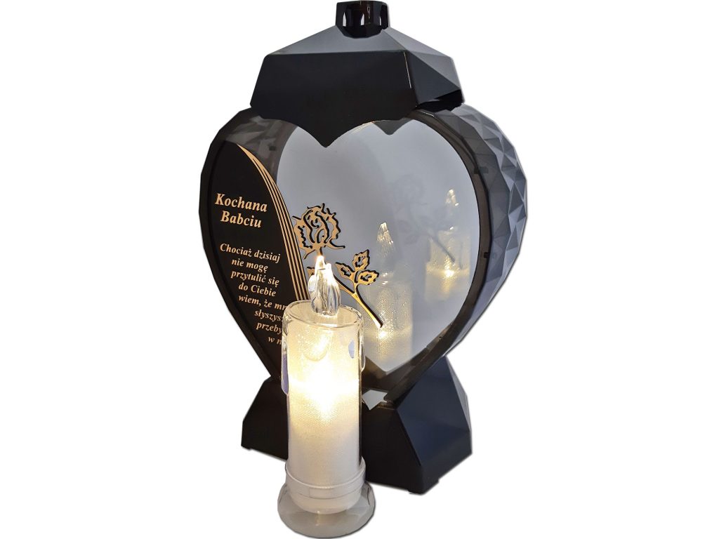 - kolor znicza: szyba przednia przezroczysta z czarno-złotą wstawką,sentencją w kolorze złotym, różyczką 3D,tylna przezroczysta,boczki przyciemniane,pokrywa i podstawa(czarna)