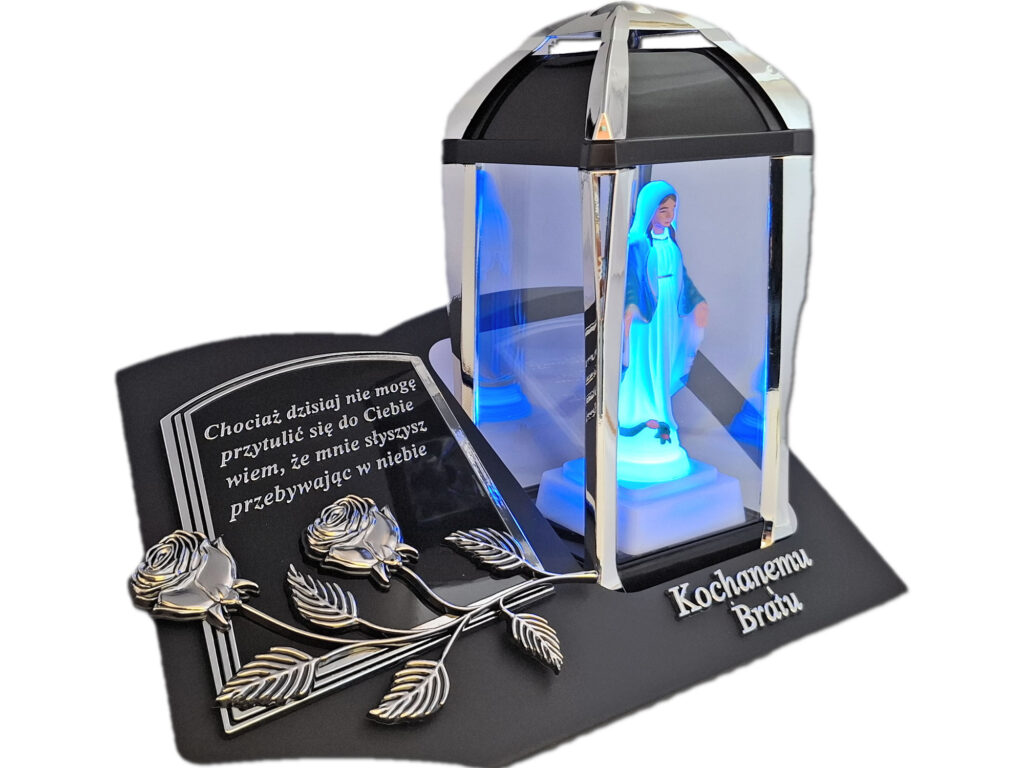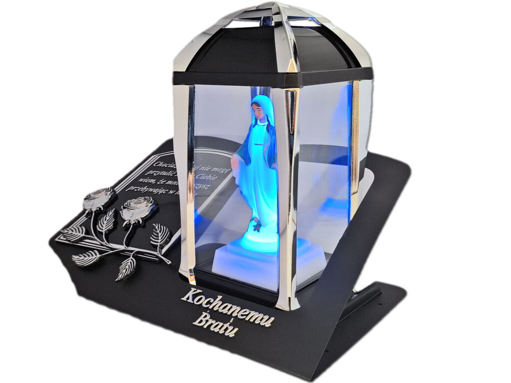 - kolor znicza: szyby przezroczyste,pokrywa, podstawa i obudowa(czarna z dodatkami srebrnego koloru)