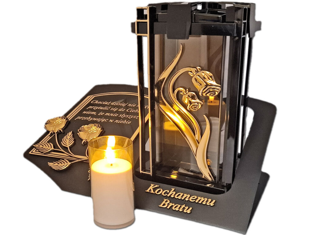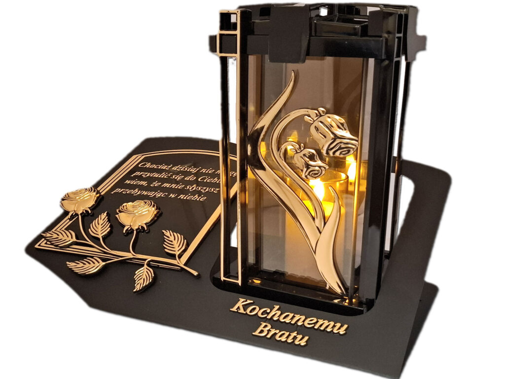 BRAT znicz PLK róża złoto czarny skos sentencja +świeca led z bateriami