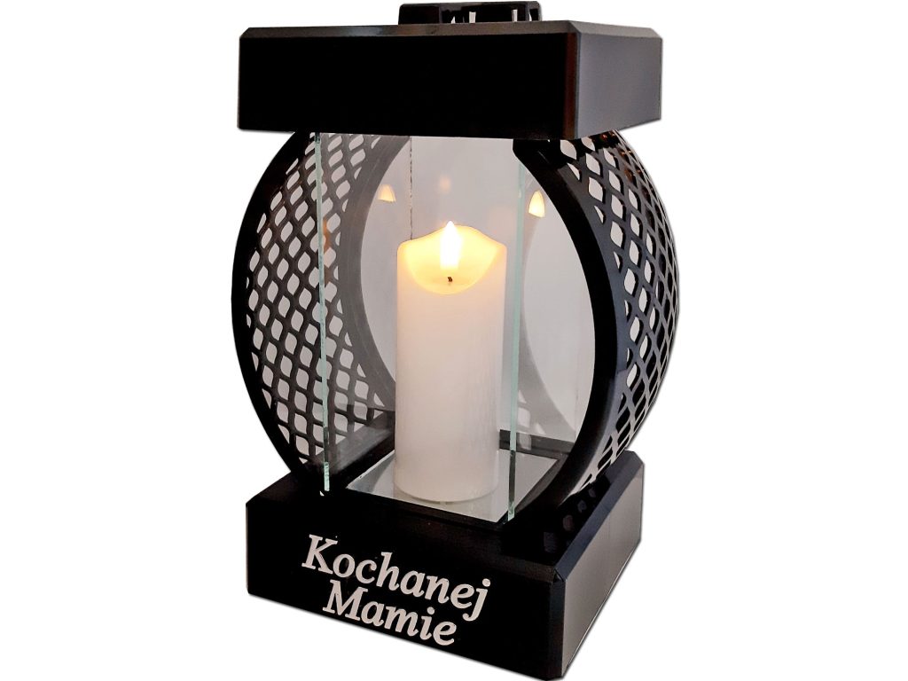• w przedniej części znicza ,dedykacja KOCHANEJ MAMIE w kolorze srebrnym