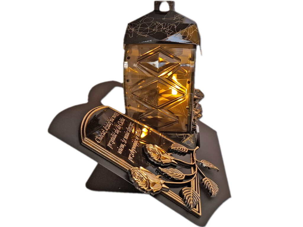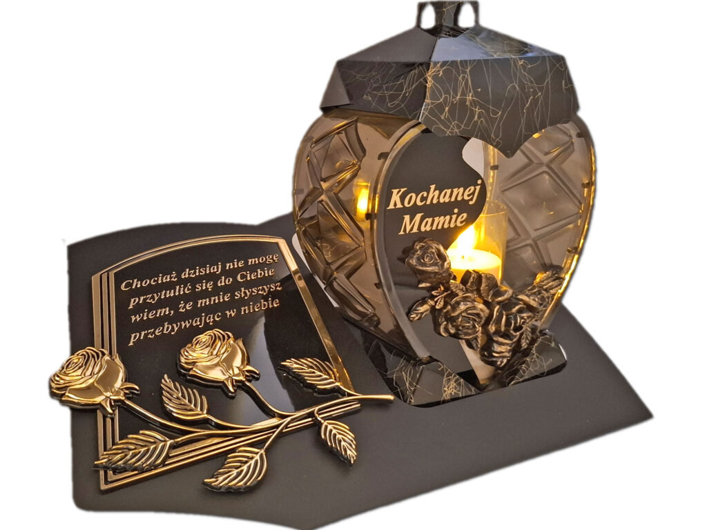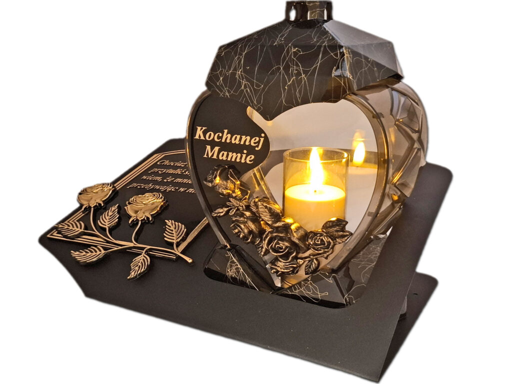- kolor znicza: szyba przednia przezroczysta z czarną wstawką i złotą różyczką 3D,tylna przezroczysta,boczki przyciemniane,pokrywa i podstawa(czarno-złoty marmurek)