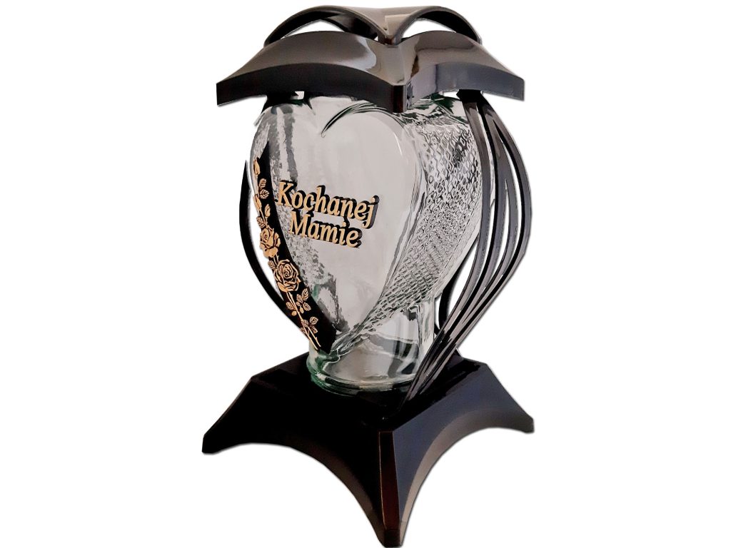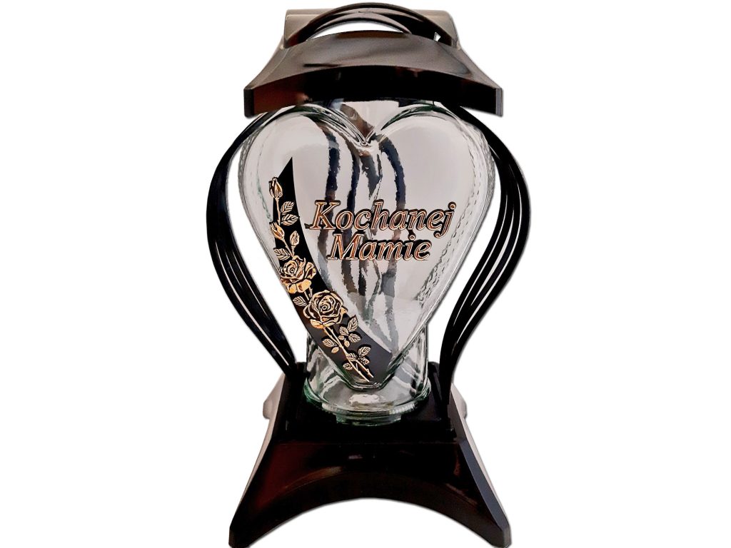 • w przedniej części znicza, wstawka z dedykacją i różyczką w kolorze złotym