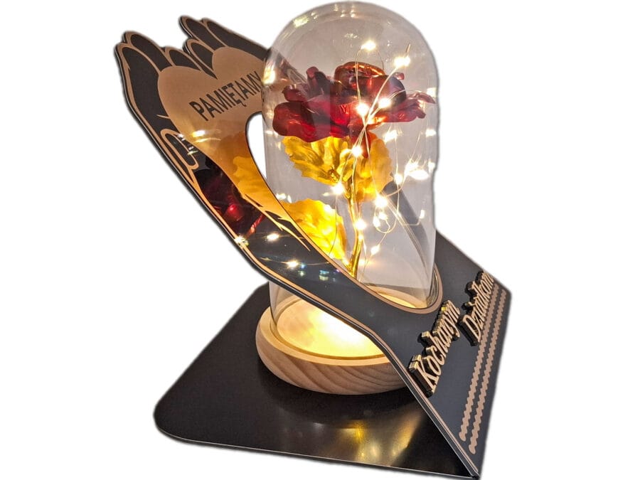kolor znicza: szyba przednia przezroczysta z czarno-złotą wstawką,sentencją w kolorze złotym, różyczką 3D,tylna przezroczysta,boczki przyciemniane,pokrywa i podstawa(czarna)