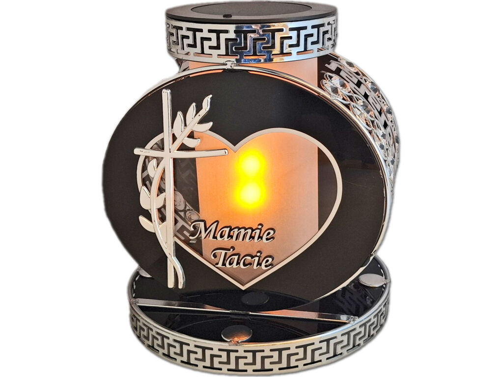 - kolor znicza: obudowa(srebrno czarna z białymi kryształkami),podstawa(czarno-srebrna)