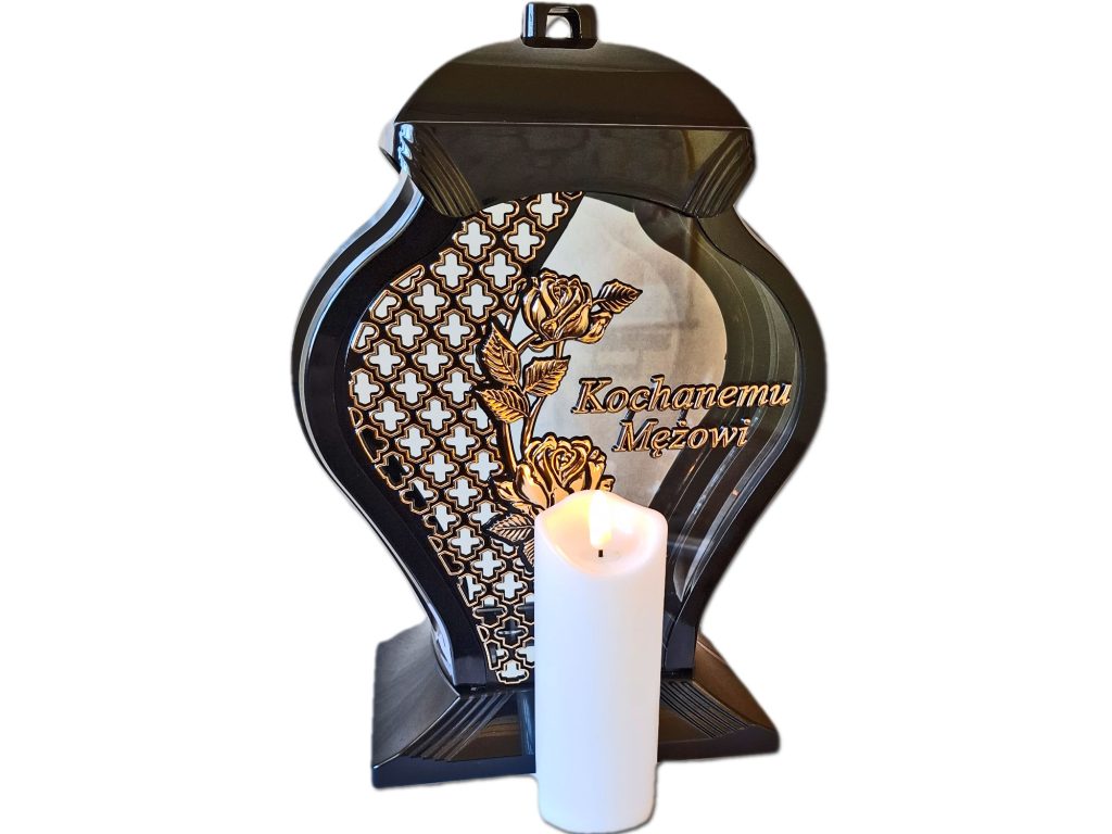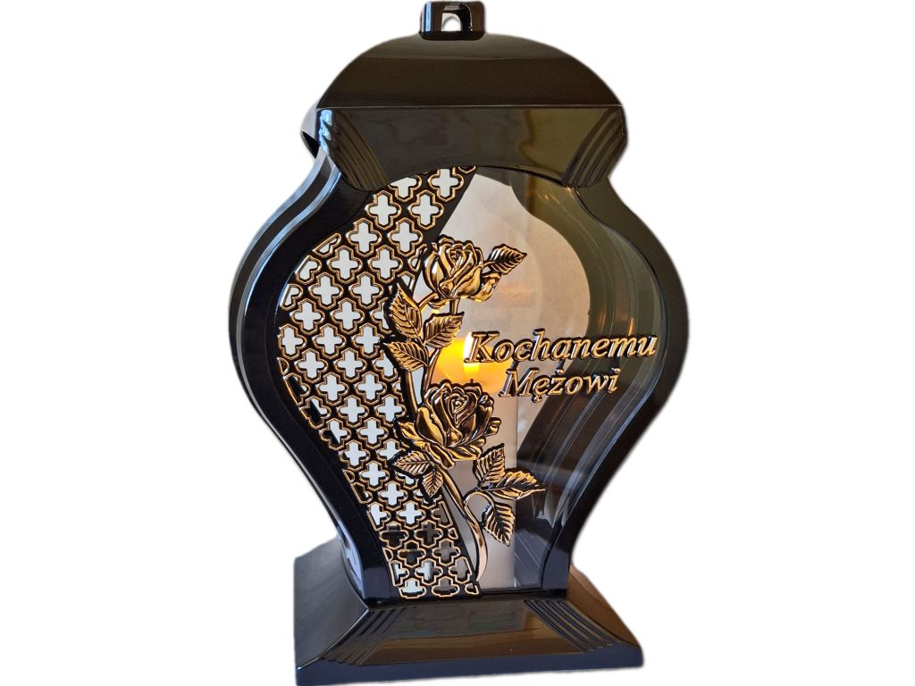 • kolor znicza: szyba przednia przezroczysta ze złotą ażurową wstawką i kwiatem w kolorze złotym ,tylna przezroczysta,boczki przyciemniane,pokrywa i podstawa(czarna)