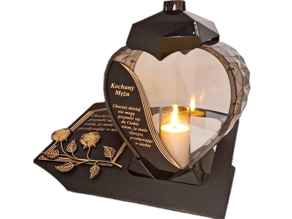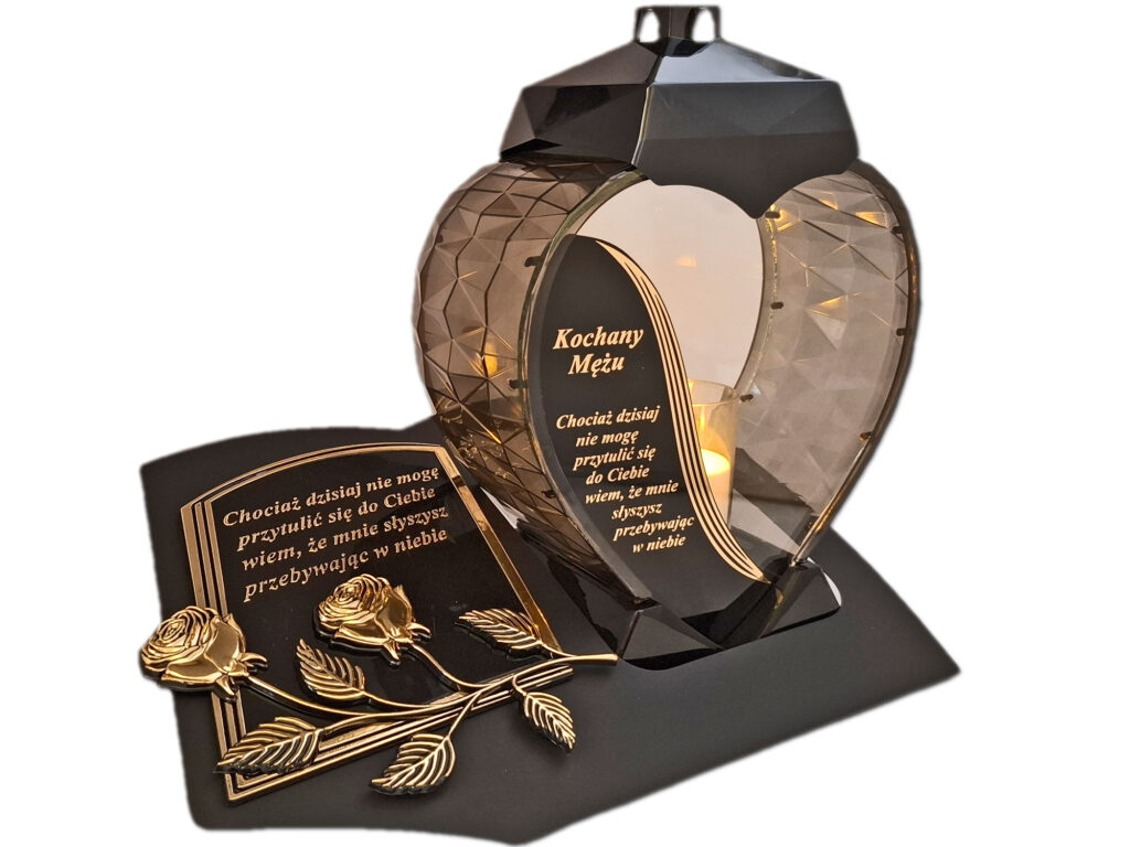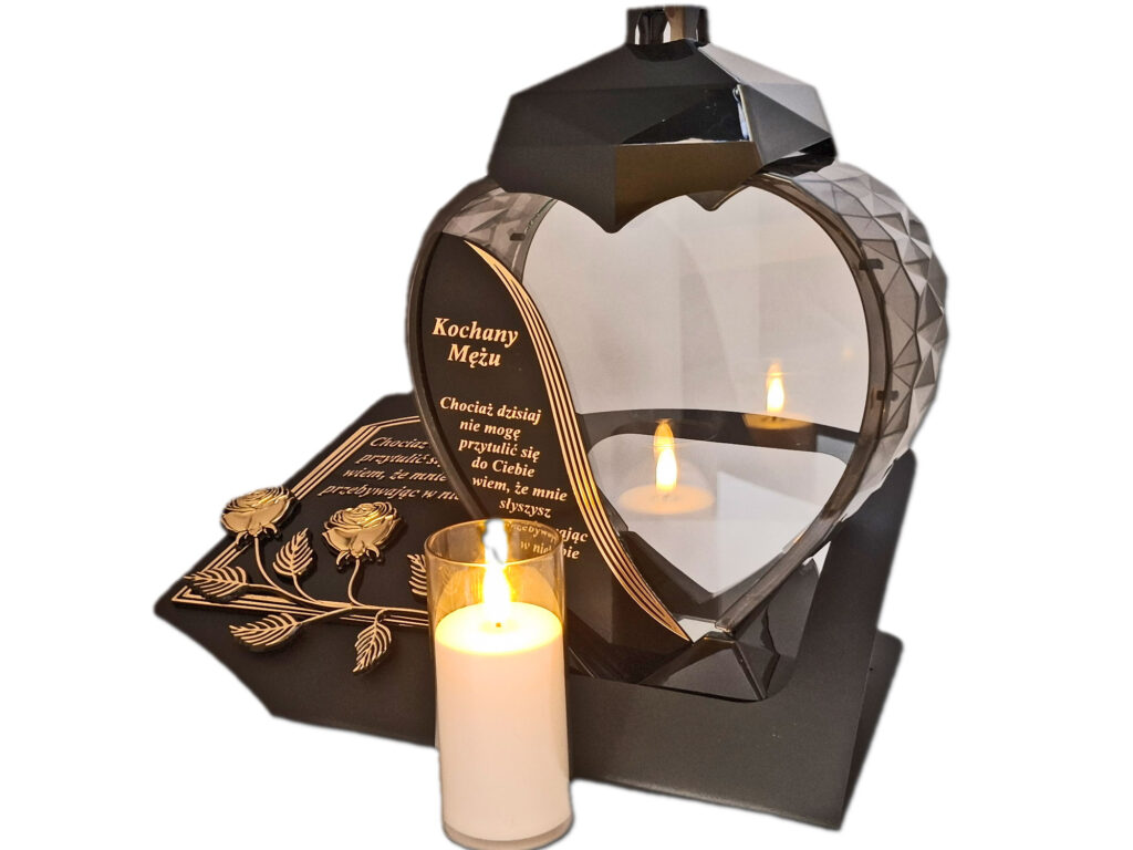 MĄŻ MĘŻOWI ZNICZ LAMPION NA GRÓB SERCE ZŁOTO SKOS SENTENCJA+ ŚWIECA
