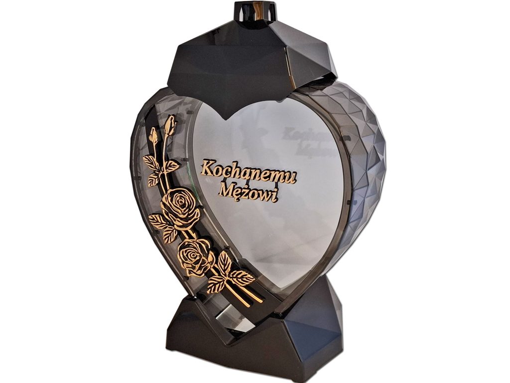 - kolor znicza: szyba przednia przezroczysta ze złotym kwiatem i dedykacją w kolorze złotym ,tylna przezroczysta,boczki przyciemniane,pokrywa i podstawa(czarna)