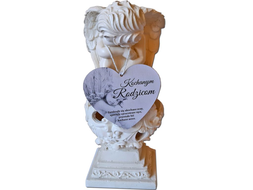 Aniołek w zestawie posiada drewniane serduszko z sentencją i dedykacją KOCHANYM RODZICOM.