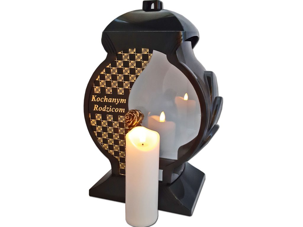 RODZICE RODZICOM ZNICZ LAMPION NA GRÓB OB CZARNO ZŁOTY+ŚWIECA LED BIAŁA