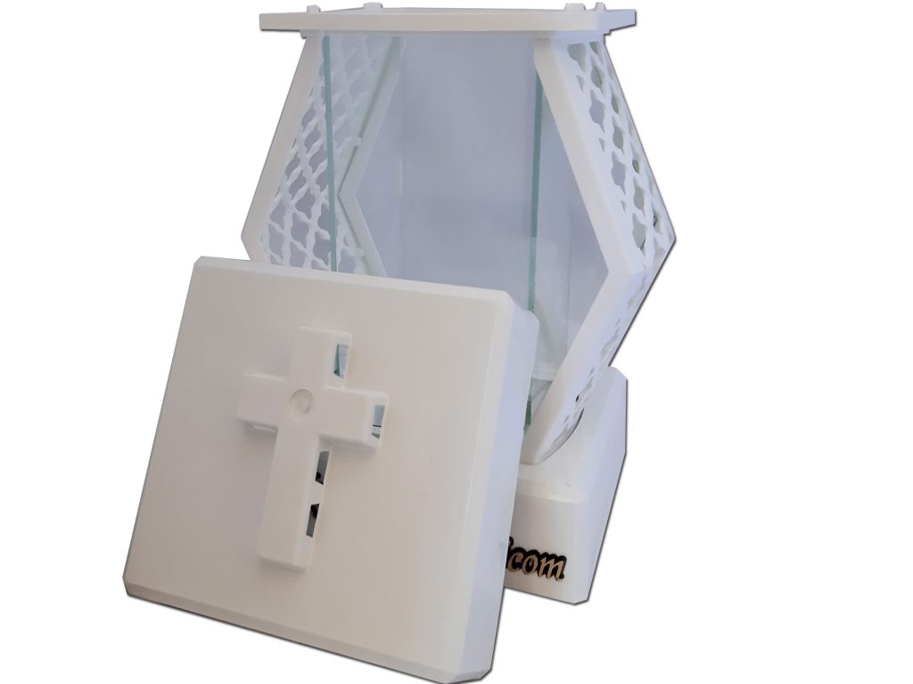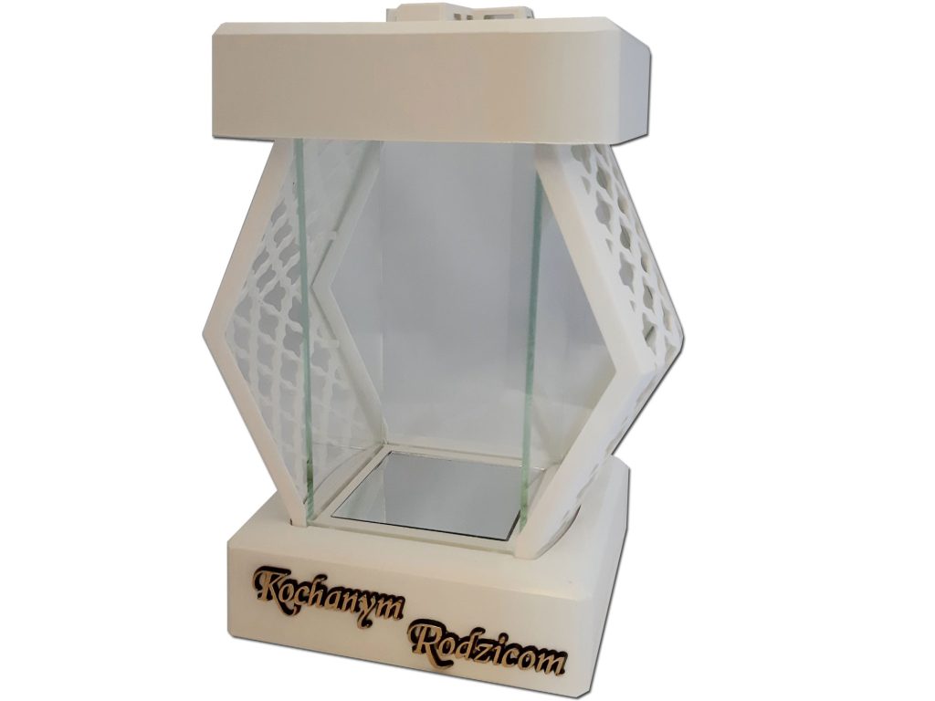 - kolor znicza:przednia szyba(przezroczysta),tylna szyba (przezroczysta),boczki ażurkowe(białe) obudowa(biała)