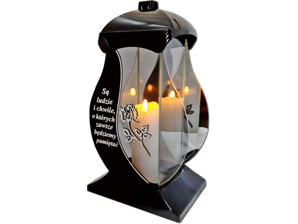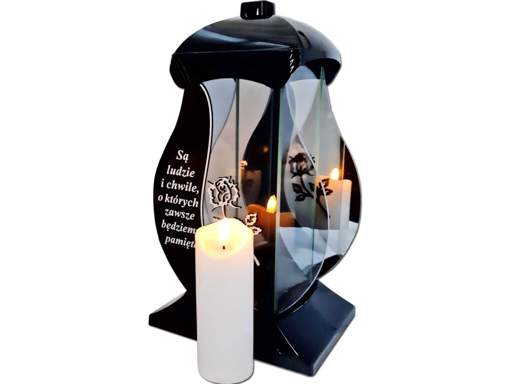 - kolor znicza: szyba przednia dymiona z czarno srebrną wstawką i różyczką ,tylna lustro,boczki przezroczyste,pokrywa i podstawa(czarna)