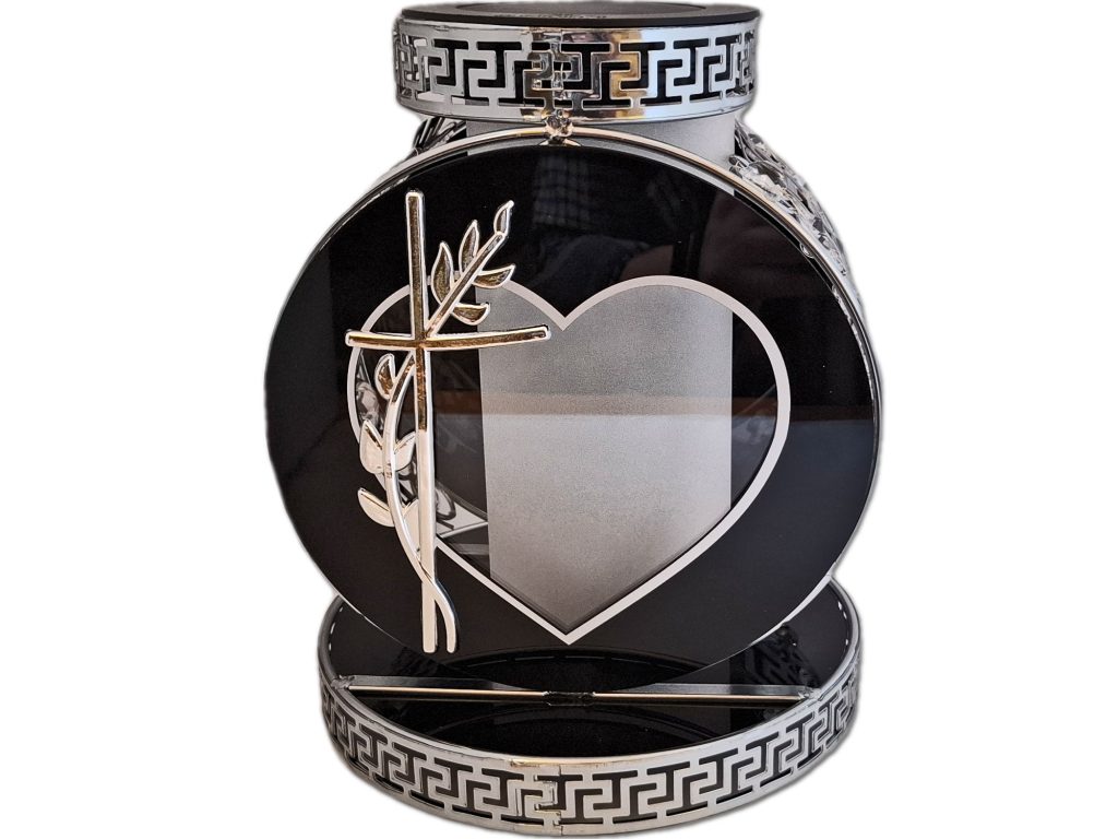 - kolor znicza: obudowa(srebrno czarna z białymi kryształkami),podstawa(czarno-srebrna)