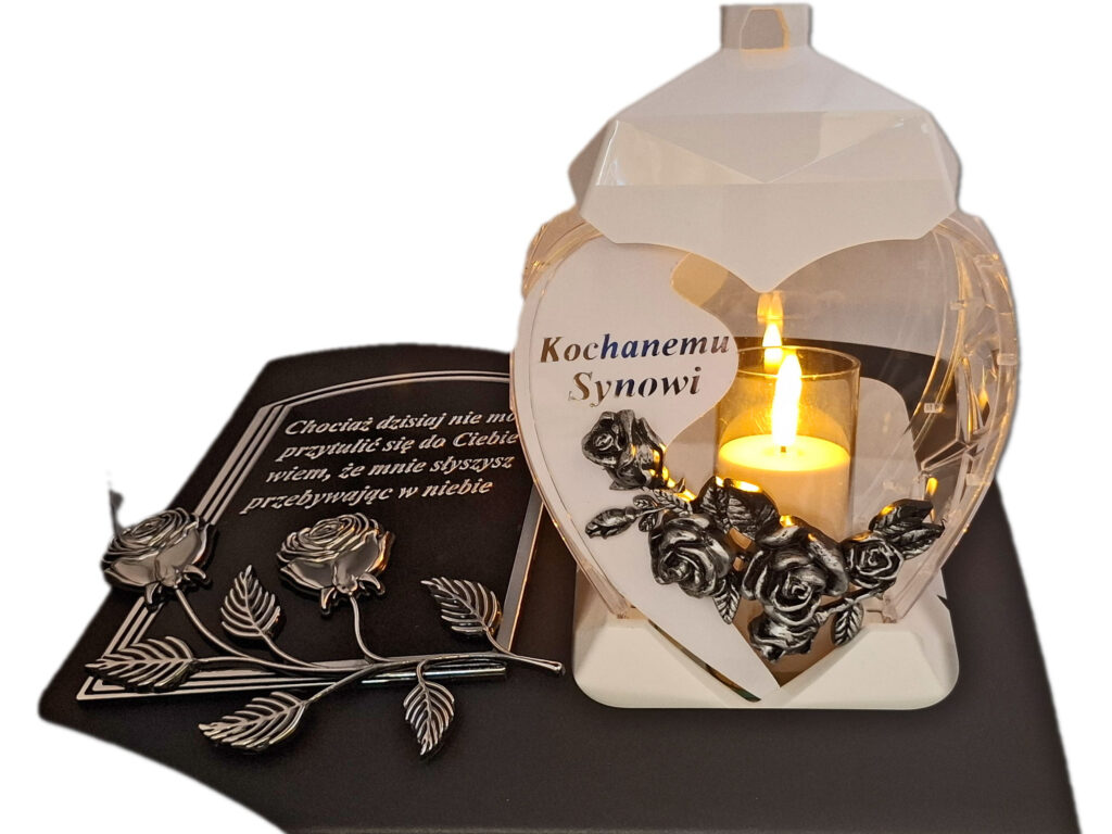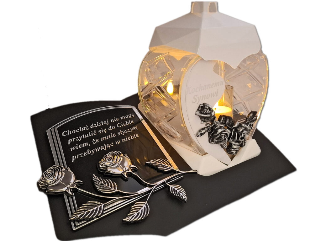 SYN znicz serce małe białe skos sentencja +świeca led z bateriami