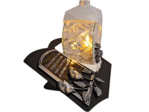 - z lewej strony podstawy aplikacja imitująca kartkę z książki z sentencją i różą 3D w kolorze srebrnym