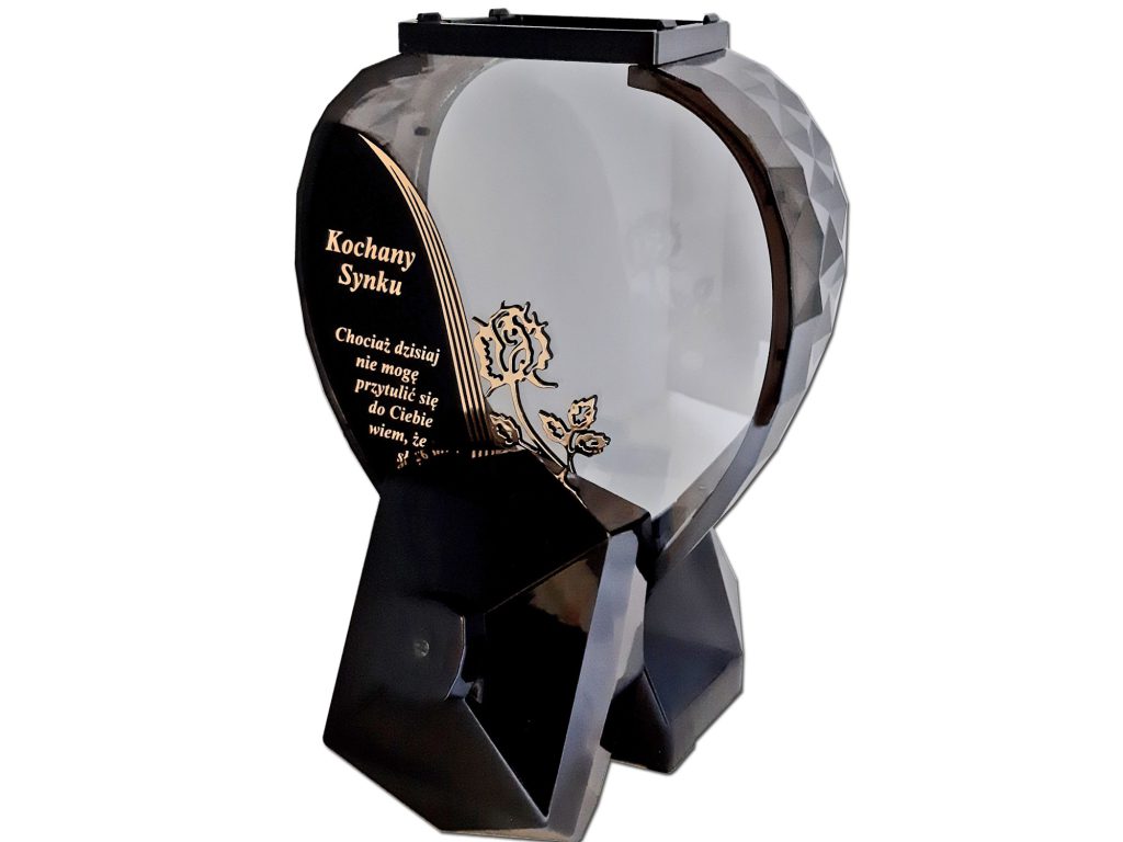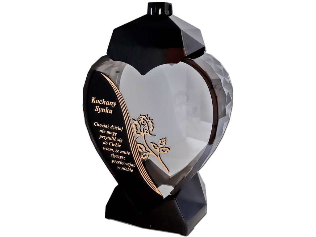 - kolor znicza: szyba przednia przezroczysta z czarno-złotą wstawką,sentencją w kolorze złotym, różyczką 3D,tylna przezroczysta,boczki przyciemniane,pokrywa i podstawa(czarna)
