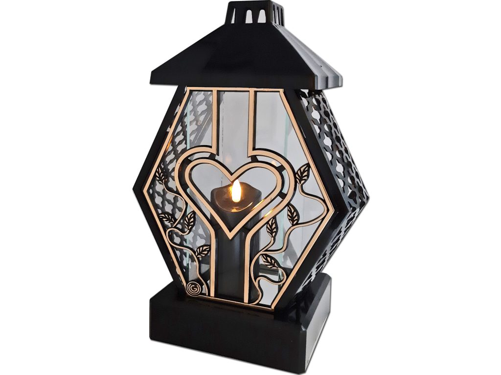 ZNICZ LAMPION NA GRÓB DMT DUŻY RTN RAMA SERCE ZŁOTO+ŚWIECA LED CZARNA