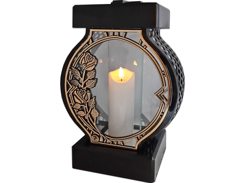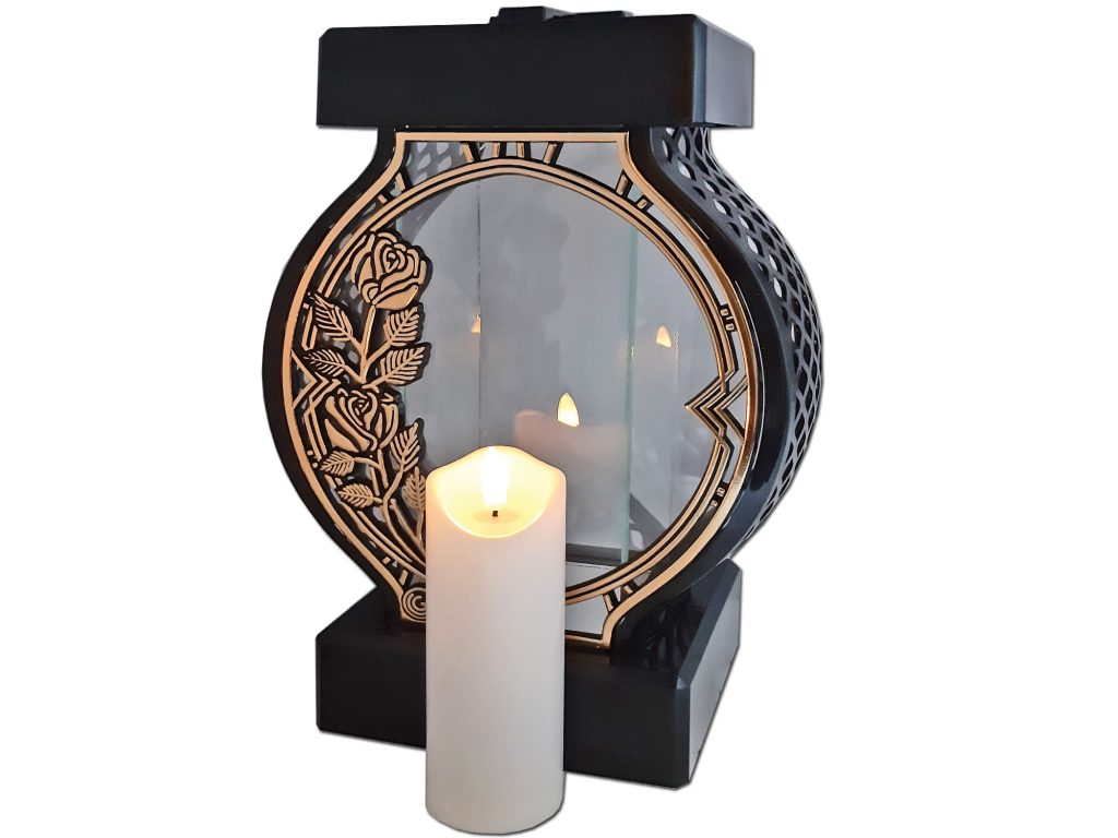 Znicz Koło RTN duże czarne rama róża złoto+świeca led biała