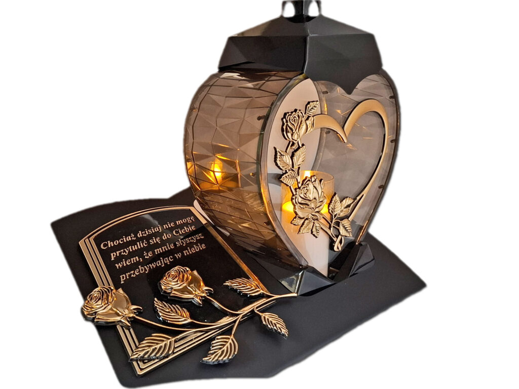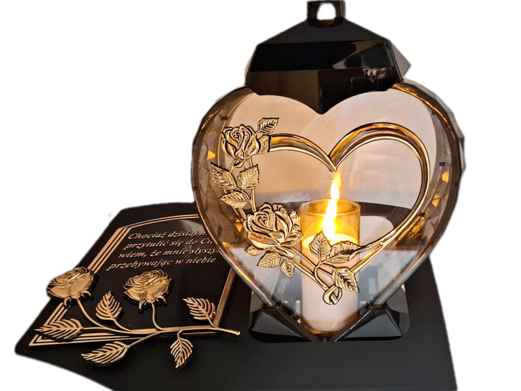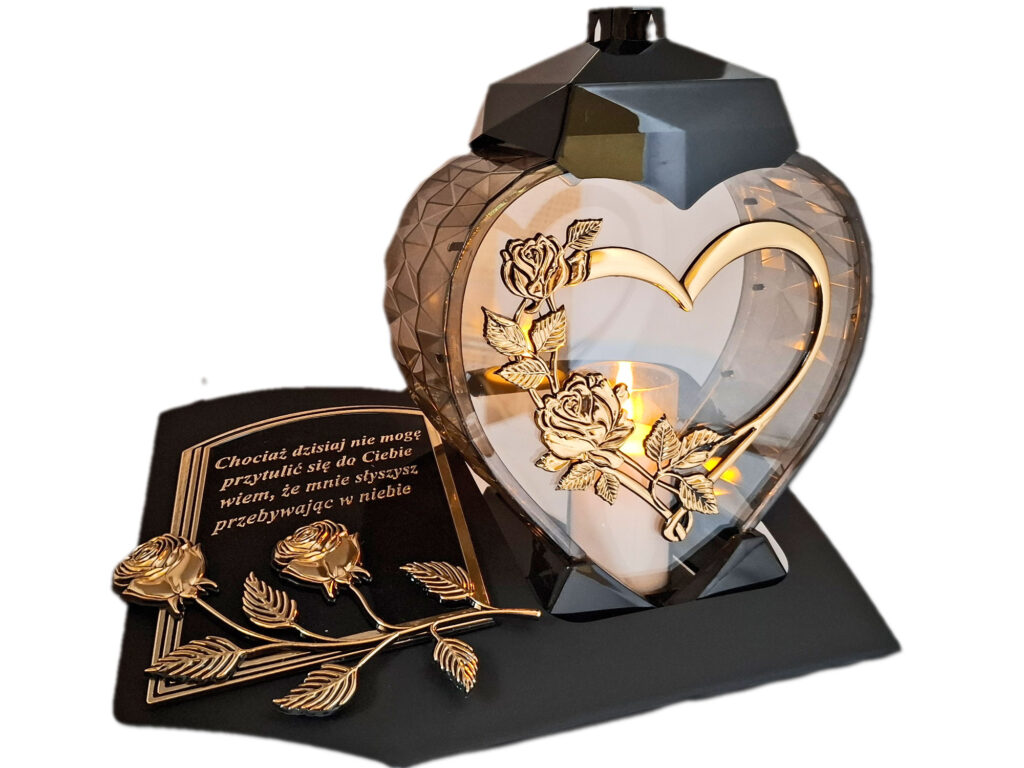 ZNICZ LAMPION NA GRÓB SERCE I SERCE ZŁOTO SKOS SENTENCJA+ ŚWIECA
