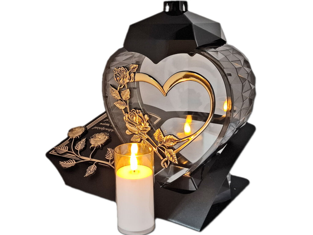 Znicz SERCE i serce złoto skos sentencja +świeca led z bateriami