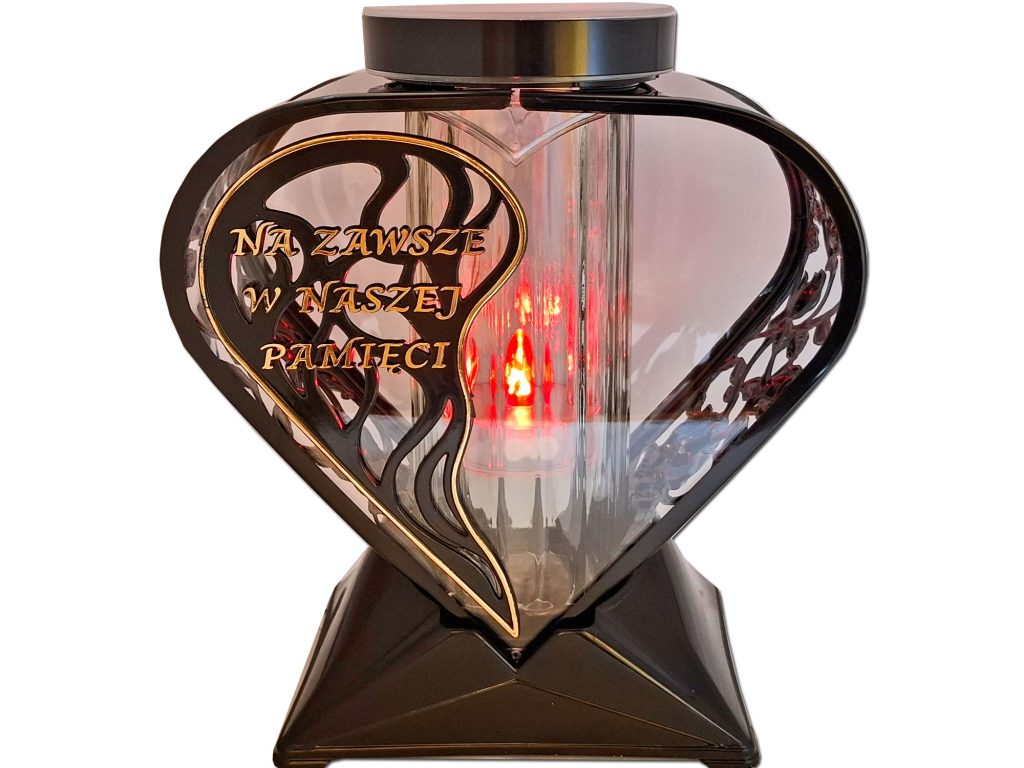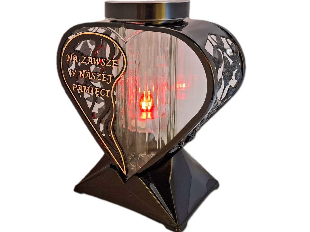 - Przód znicza z czarną wstawką i sentencją NA ZAWSZE W NASZEJ PAMIĘCI w kolorze złotym