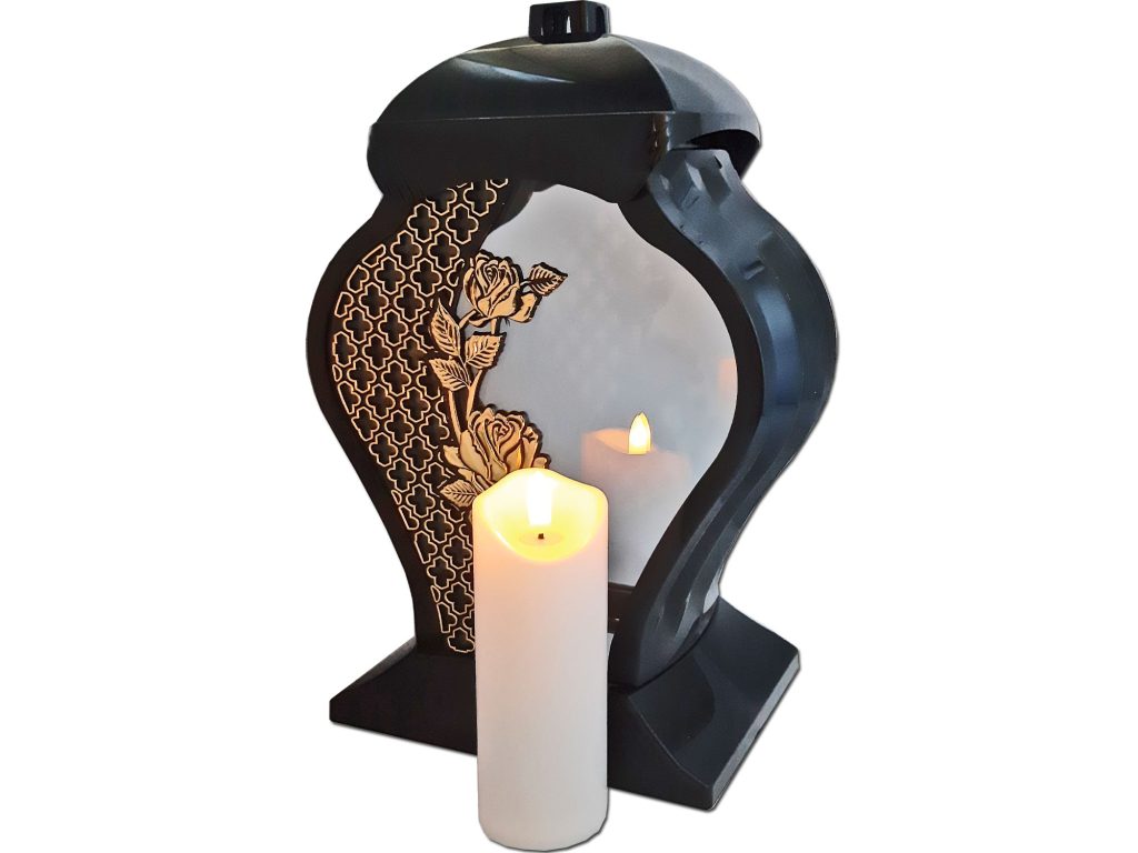 - kolor znicza: szyba przednia przezroczysta ze złotą ażurową wstawką i kwiatem w kolorze złotym ,tylna przezroczysta,boczki przyciemniane,pokrywa i podstawa(czarna)