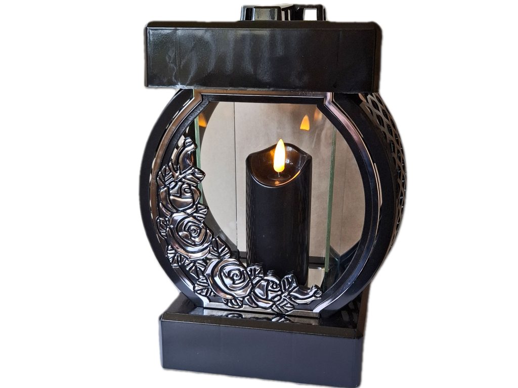 Znicz Koło RTN Róża rama srebro+świeca led czarna