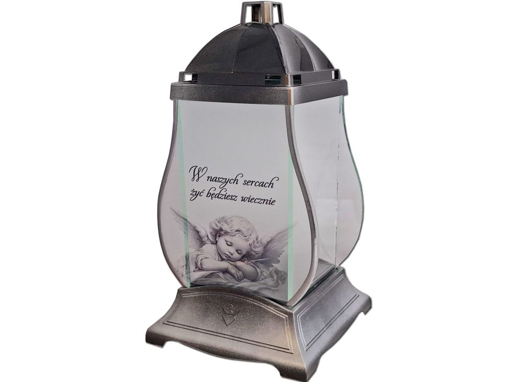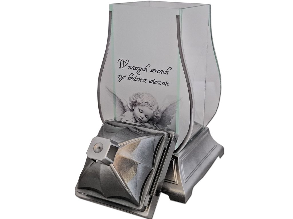 - kolor znicza: szyba przednia satynowa z grafiką,tylna i boczne (przezroczyste),pokrywa i podstawa(srebrno-czarna)