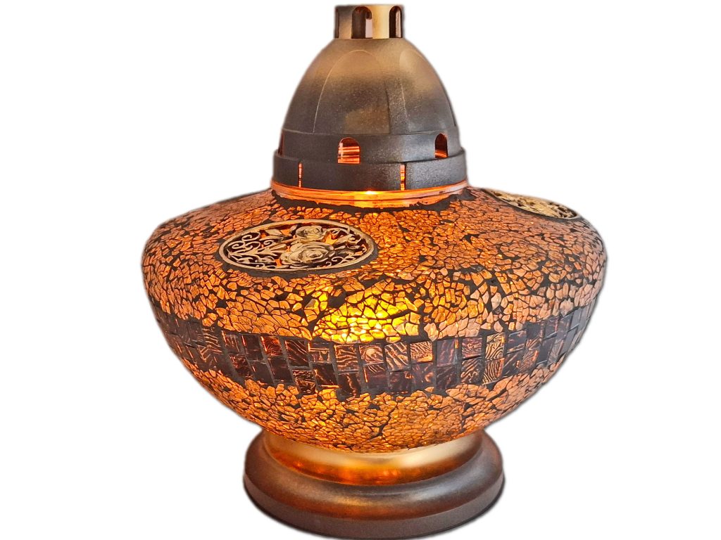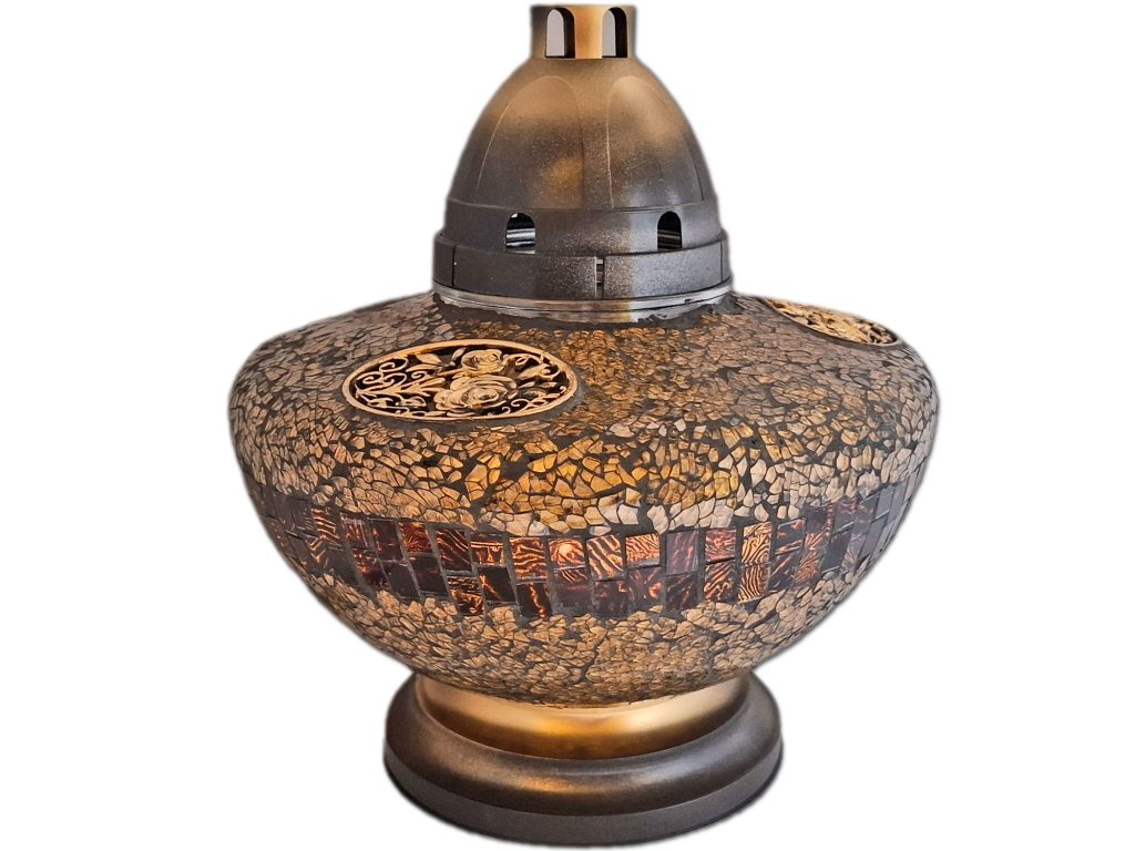 Na zewnętrznej powierzchni szklanej znicza, ręcznie wykonana mozaika z drobnych szkiełek.