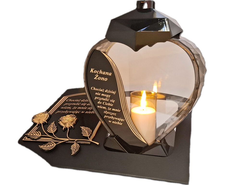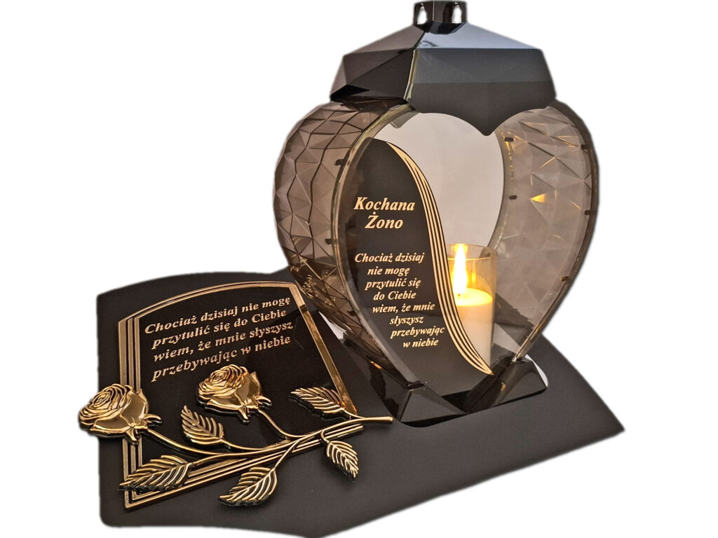 ŻONA ŻONIE ZNICZ LAMPION NA GRÓB SERCE ZŁOTO SKOS SENTENCJA+ ŚWIECA