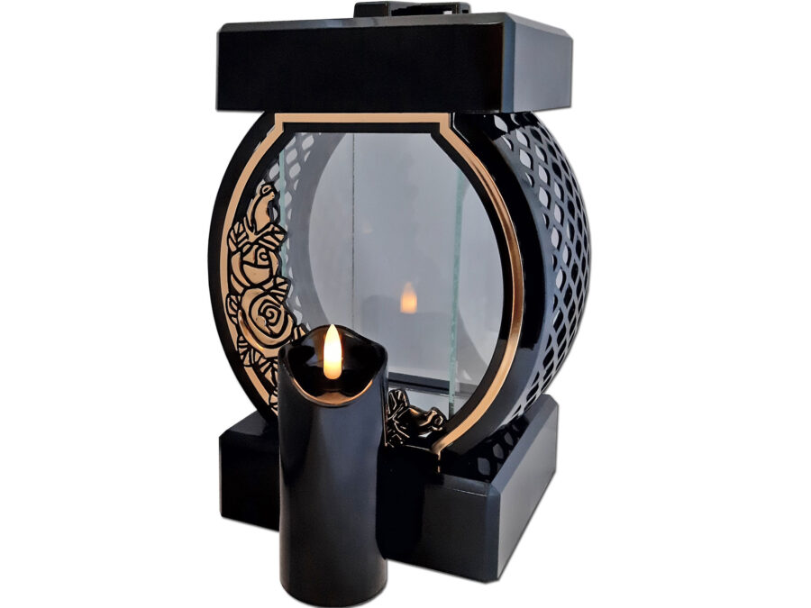 ZNICZ ZNICZE LAMPION NA GRÓB KOŁO RTN RÓŻA RAMA ZŁOTO+ŚWIECA LED CZARNA